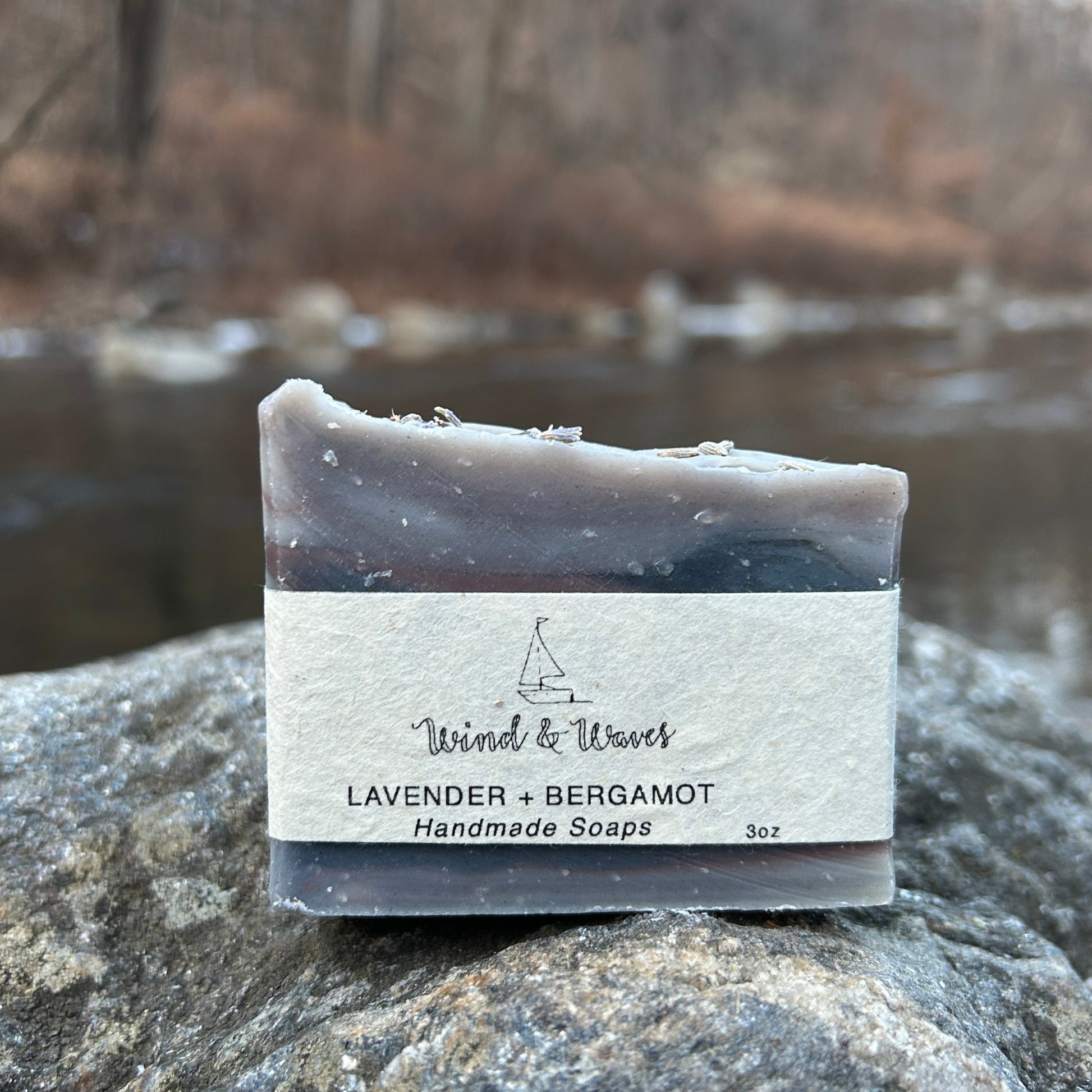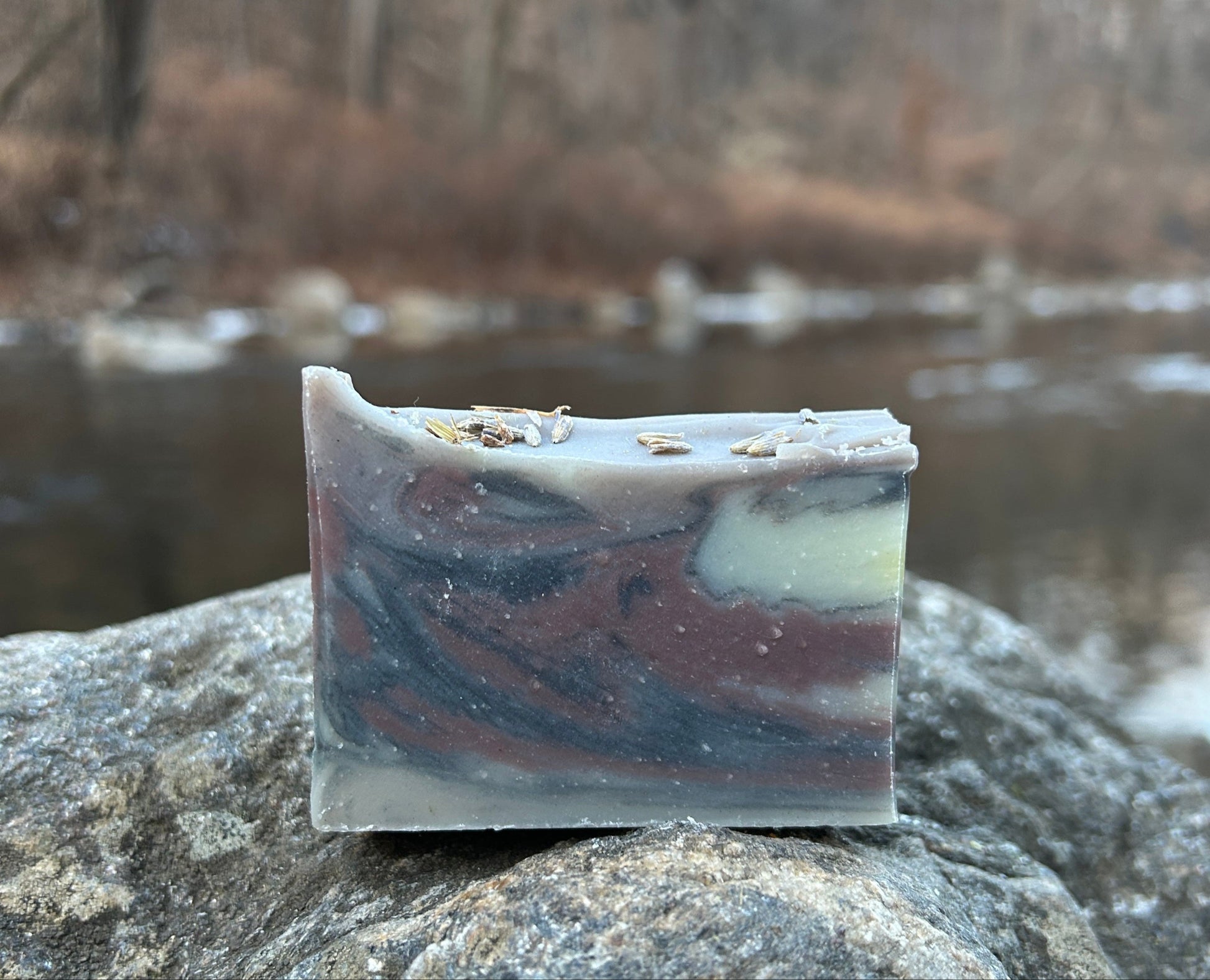 Ingredients: Organic Coconut Oil, Olive Oil, Shea Butter, Mango Seed Butter, Sunflower Oil, Castor Oil, Water, Sodium Hydroxide, Sodium Lactate, Vitamin E, Purple Brazilian Clay, Activated Charcoal, Gray Clay, Indigo Powder, Lavender Flowers, Lavender + Bergamot + Black Pepper Essential Oils.